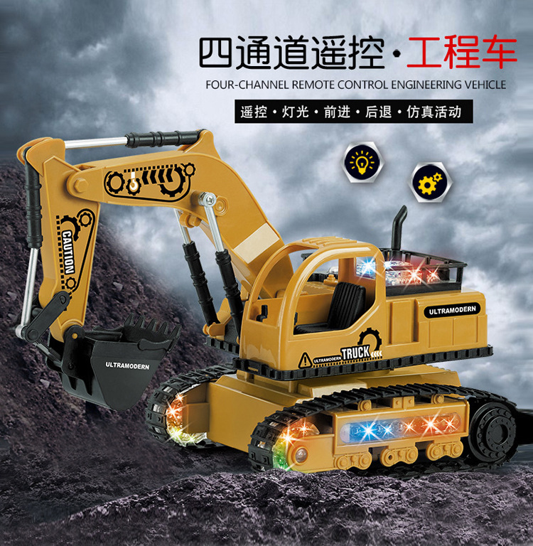 Mainan pengendali jarak jauh anak-anak, kendaraan teknik kendali jarak jauh simulasi tanpa kabel lampu empat saluran dapat diisi ulang satu buah
