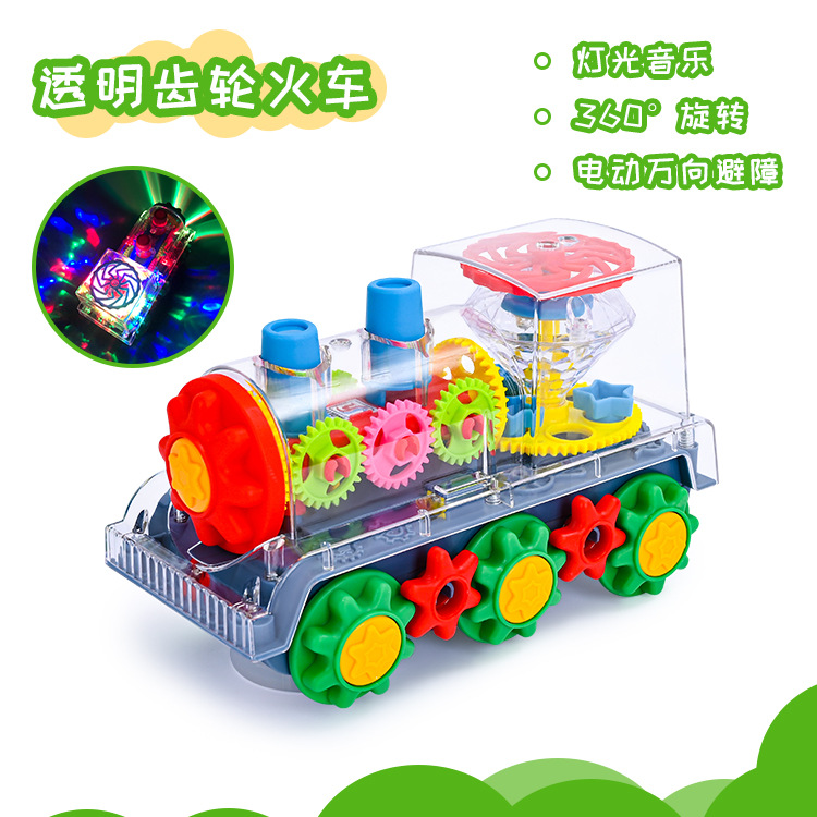 Transparan gigi berputar lokomotif lampu warna-warni musik anak-anak hadiah ulang tahun Wanxiang mobil mainan listrik grosir