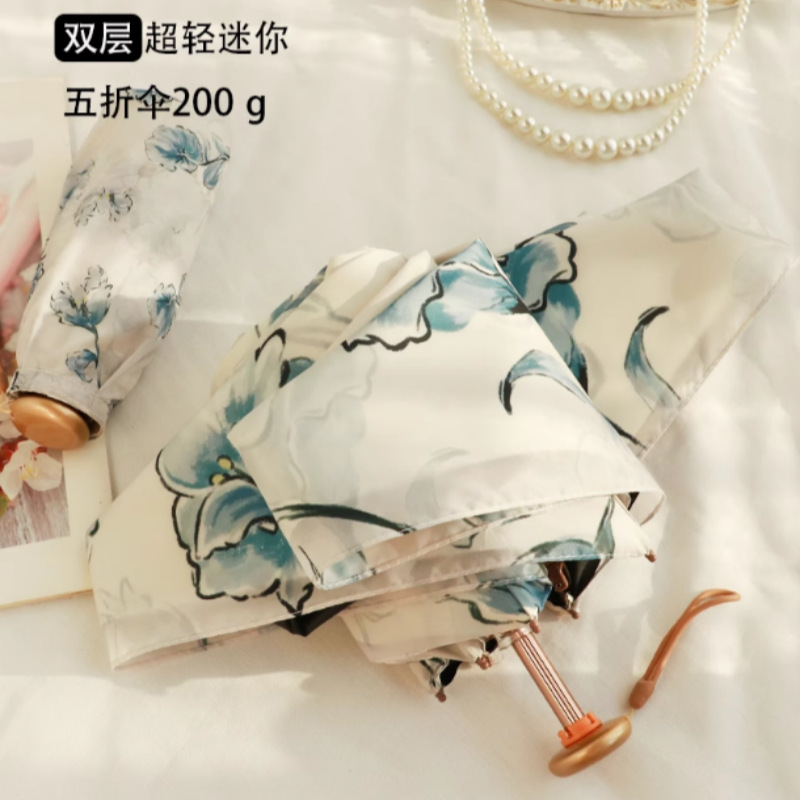 Payung matahari terlihat tinggi, payung bunga lima lipat gaya Perancis, perlindungan UV hujan dan hujan penggunaan ganda ultra ringan portabel