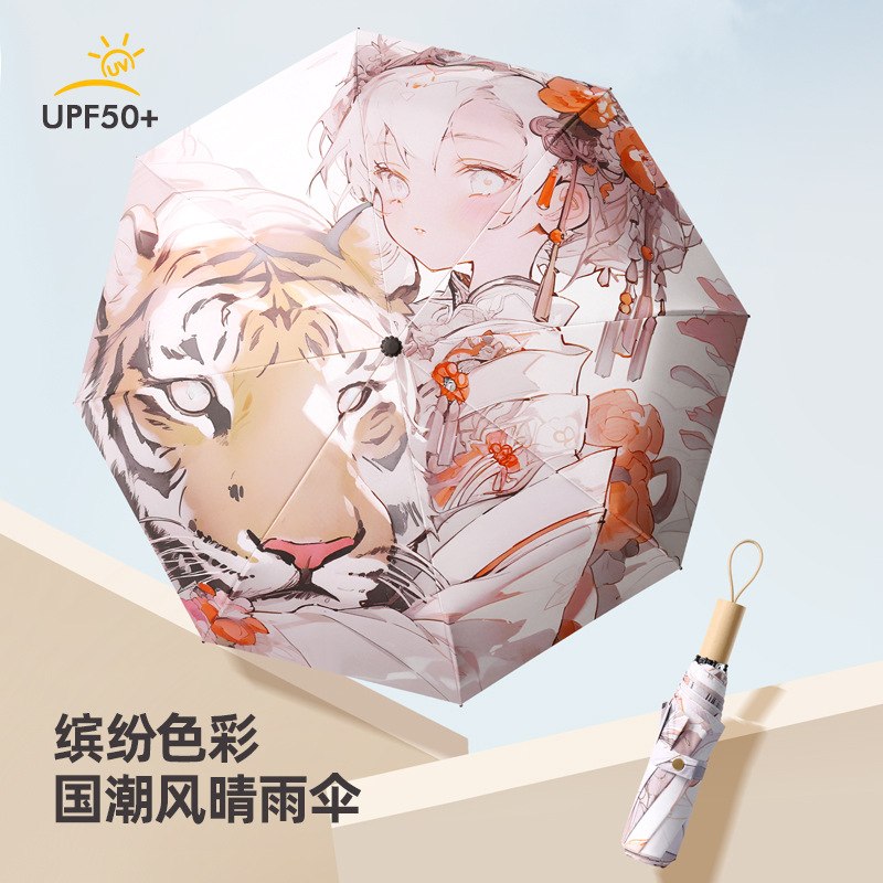 Payung tujuan ganda gaya Tiongkok untuk pelindung matahari, payung lipat tiga perlindungan UV cerah dan hujan untuk siswa, payung pelindung matahari lem hitam