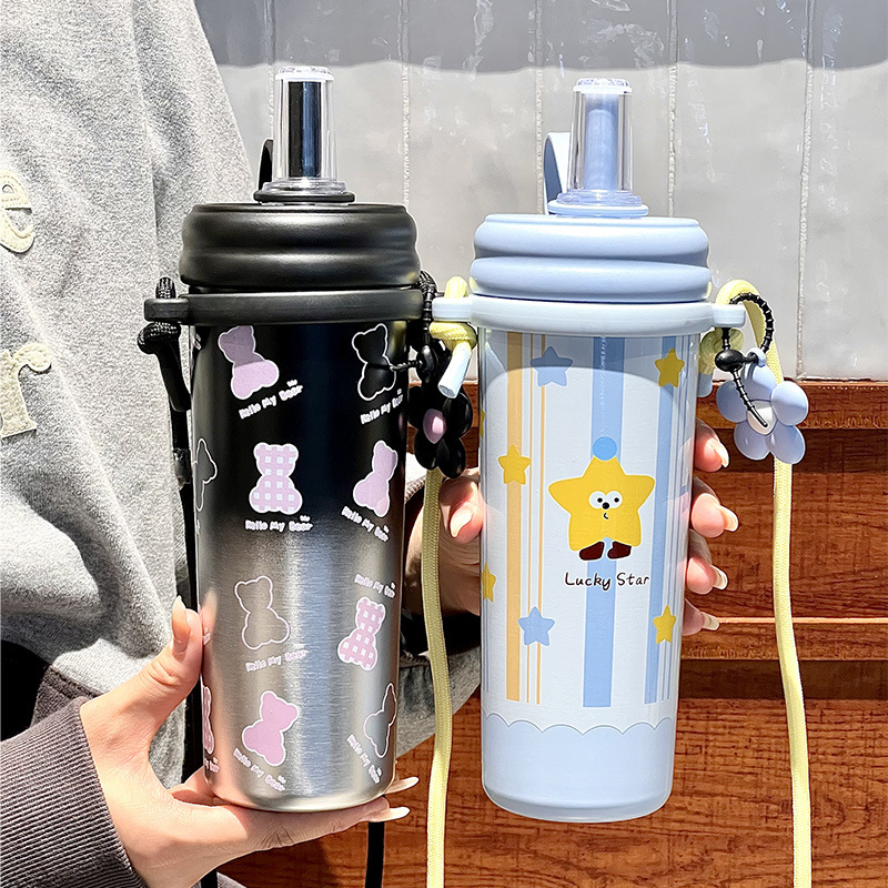 Sedotan Gelas Tahan Panas Anak Perempuan Nilai Wajah Tinggi Portabel Model Baru 2024 Tali Tali Gelas Air Kapasitas Besar Gelas Anak-anak Lucu