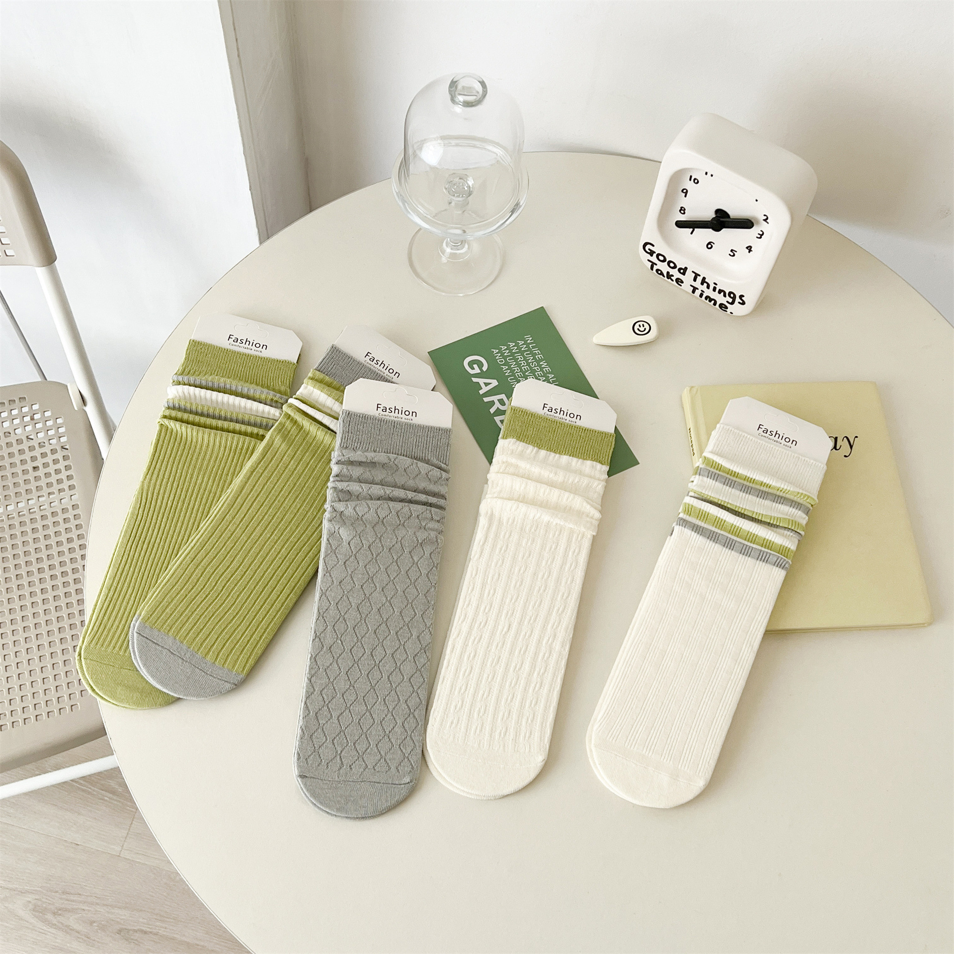 Kaus kaki tumpukan baru musim semi dan musim panas kaus kaki setengah hijau wanita kaus kaki jarum ganda bergaris sederhana Zuji bedak kaus kaki
