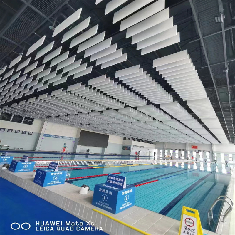 Serat kaca menggantung film vertikal aula renang laporan ruang langit-langit datar modul peredam suara bola basket aula bingkai aluminium penyerap suara