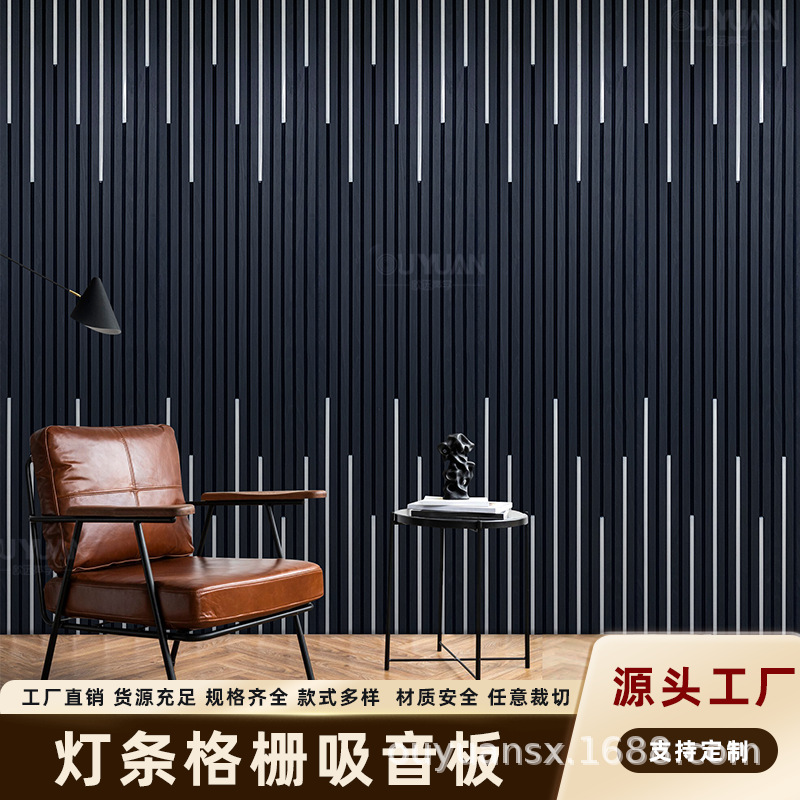 Panel dekorasi dinding MDF kedap suara dengan strip lampu, panel penyerap suara dengan kisi-kisi kayu, panel penyerap suara dengan strip kayu LED tertanam