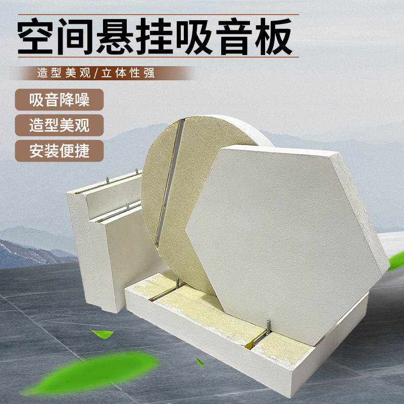 Panel akustik langit-langit bundar, tahan api, peredam suara, ramah lingkungan, bilah fiberglass gantung, panel akustik berbentuk pulau, perlindungan api Kelas A.