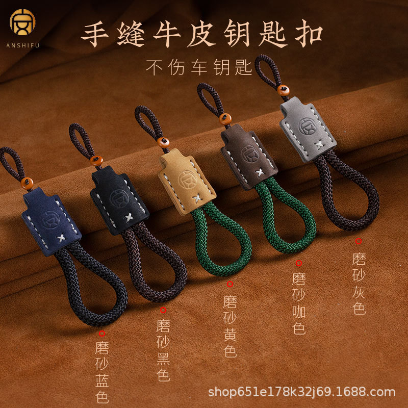 Gantungan kunci kulit sapi asli lapis pertama dengan benang giok, simpul berlian, jahitan tangan, tali anti-hilang, rantai benang lilin, simpel, gantungan pinggang, kunci mobil