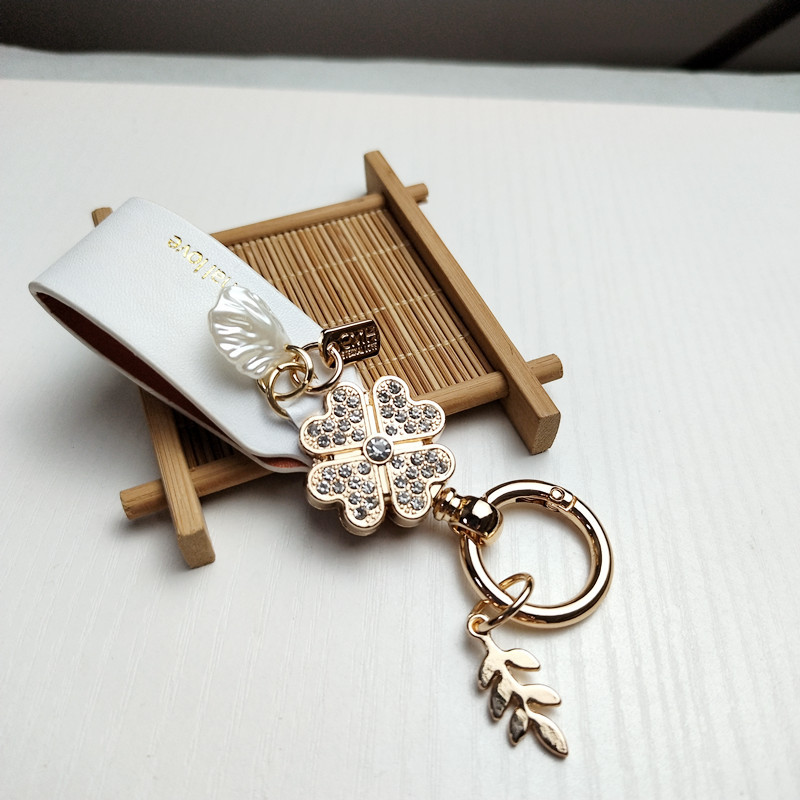 Gantungan kunci hati untuk perempuan, liontin rantai kunci daun kecil logam tanam berlian cangkang alami gaya nasional Tiongkok kreatif