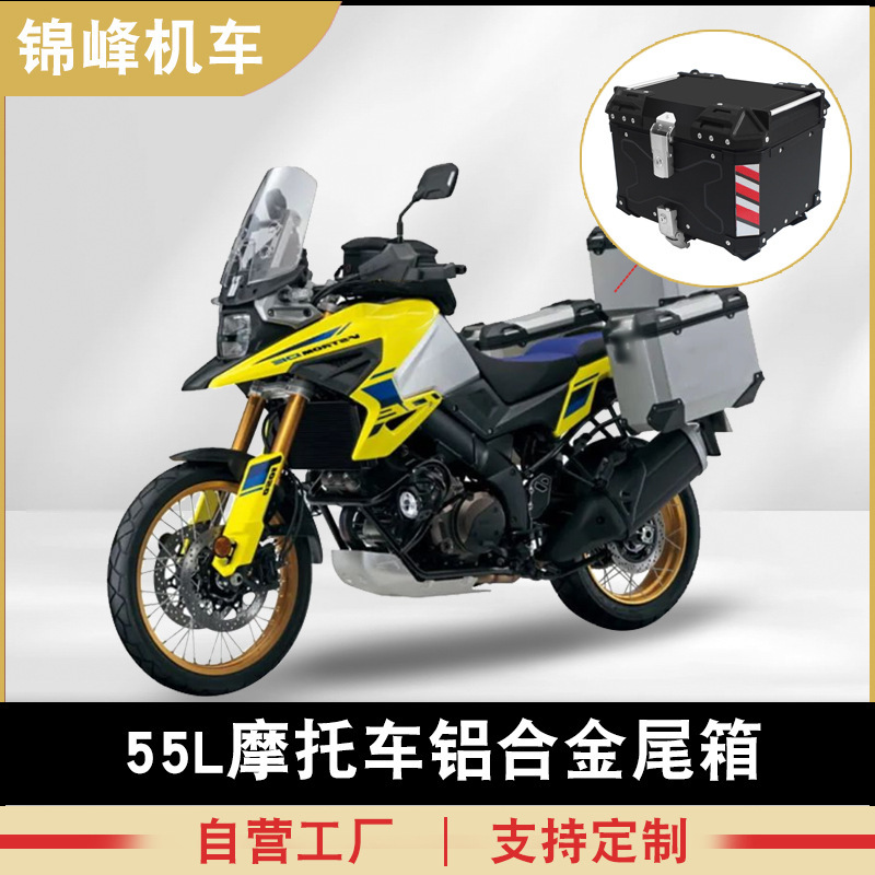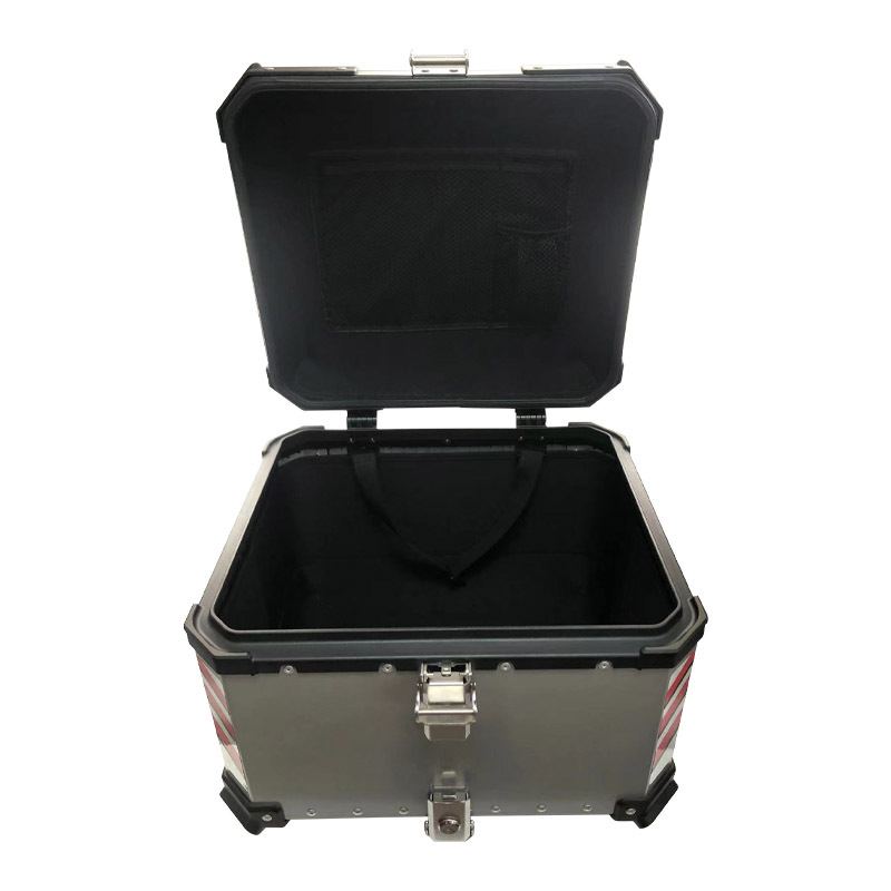 Box bagasi motor grosir pabrik, bahan aluminium alloy dan PP/ABS, dengan emboss X, model flat.