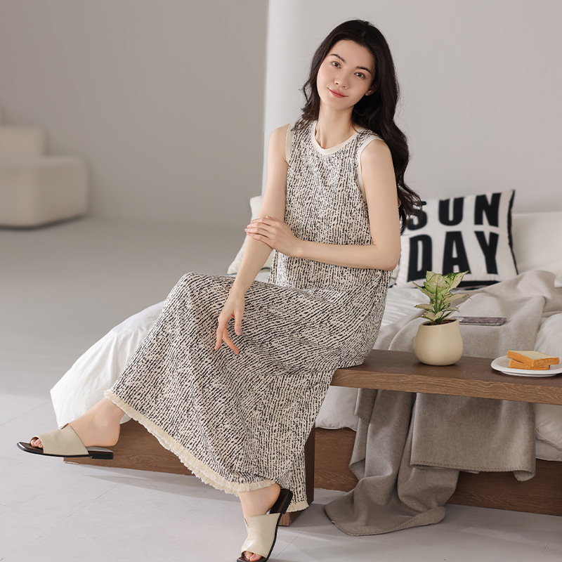 Rok Tidur dengan Bantalan Dada Rok Panjang Tank-top Model Tipis Modal Musim Panas Wanita Musim Panas Model Baru Tahun 2025 Rok Piyama Tanpa Lengan