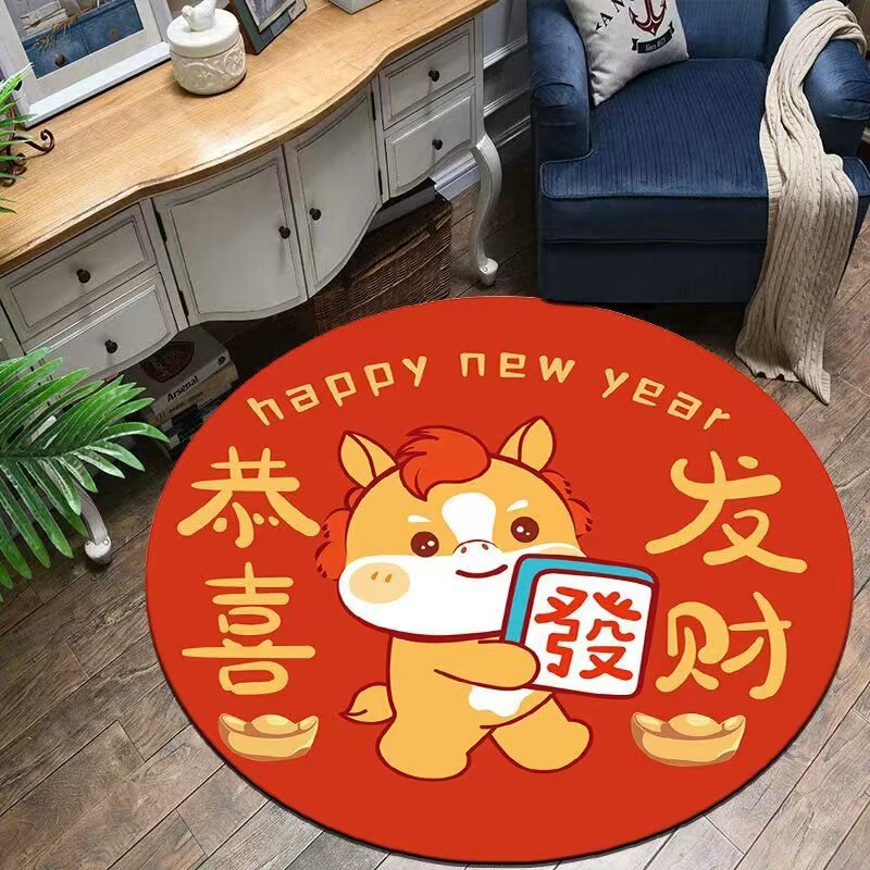 卡通新年祝福地毯马年抓周垫周岁礼圆形儿童房水晶绒地垫易打理