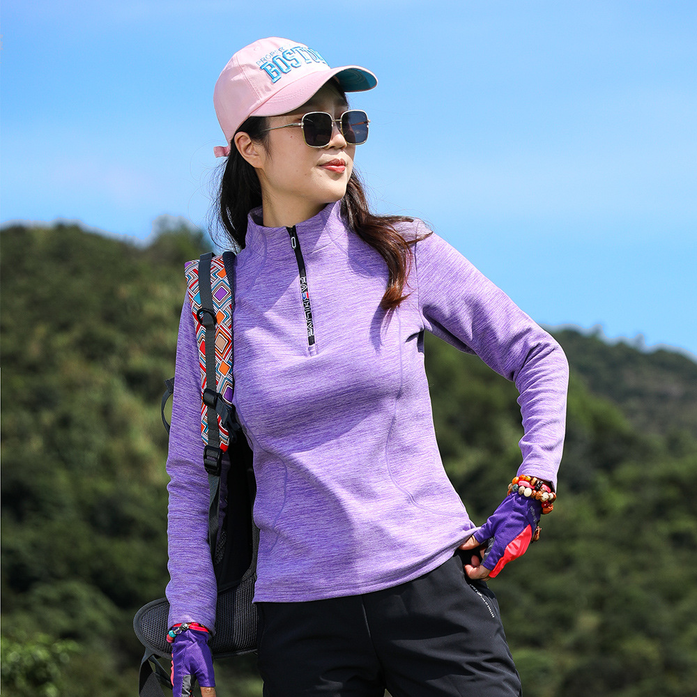 Kaus lengan panjang wanita, atasan olahraga luar ruangan bulu melar, pakaian hangat dipertebal disikat mewah anti statis musim dingin