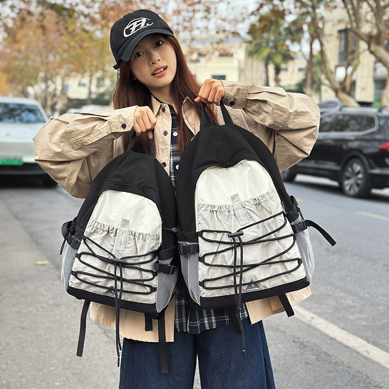 Tas Punggung Perjalanan Ringan Model Baru Lintas Batas Tas Ransel dengan Penutup Tali Serut Warna Kontras Trendi Tas Mendaki Gunung Santai Kapasitas Besar Wanita
