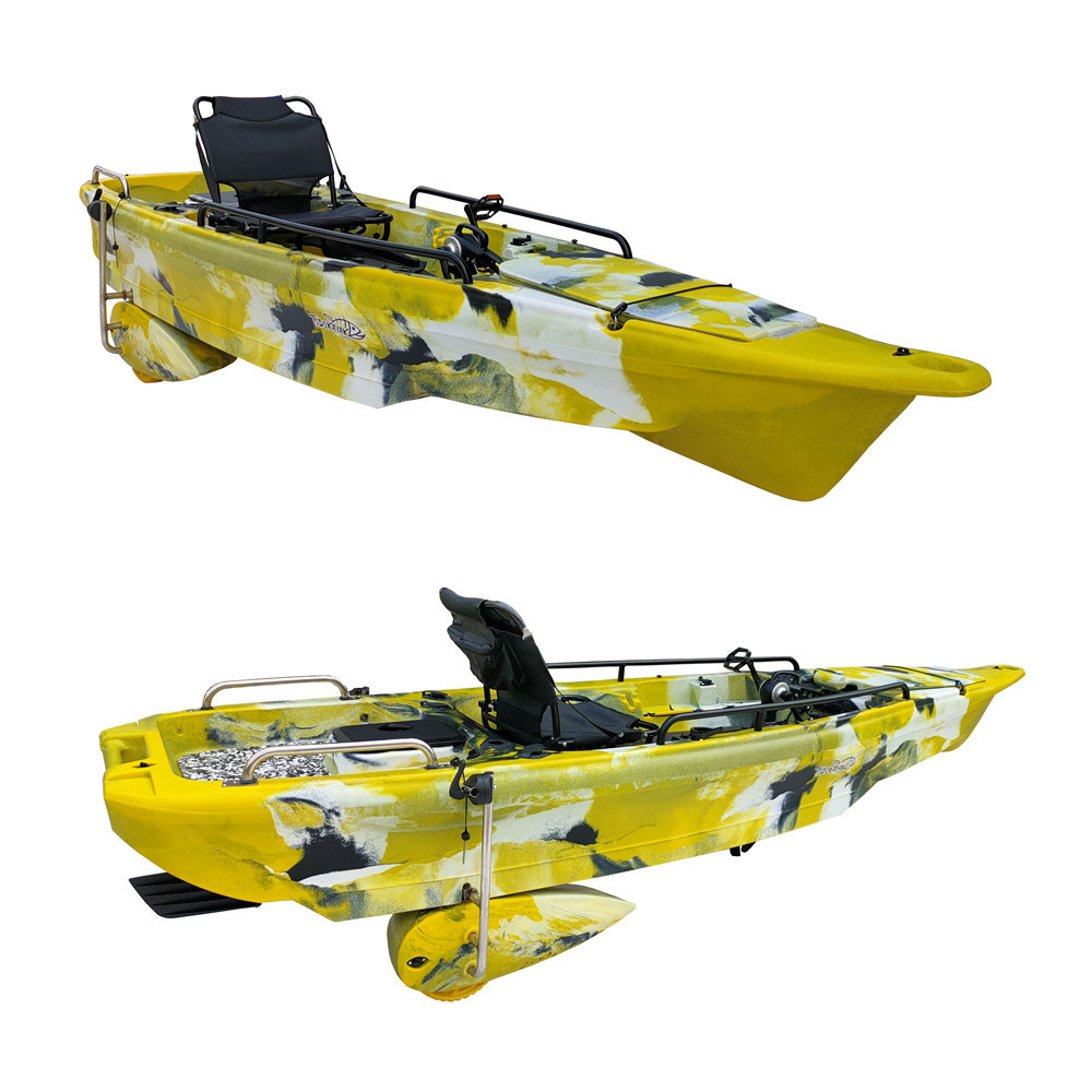 Kayak plastik tunggal besar, perahu memancing dengan ember mengambang dan pedal logam