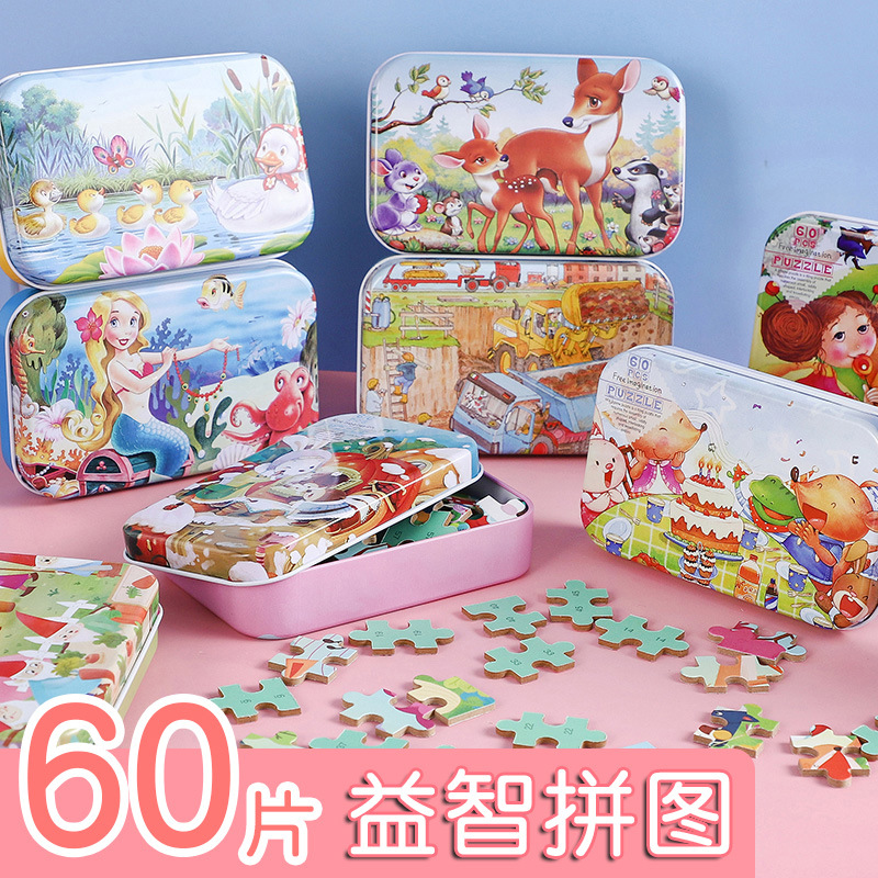 Kotak besi puzzle kayu 60 buah, teka-teki kayu kartun pendidikan datar hadiah anak-anak pendidikan dini puzzle taman kanak-kanak