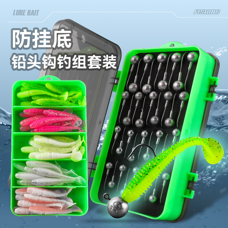 Umpan pancing Luya Anti-tail, kait kepala timbal bawah yang diperkuat, umpan palsu t-tail, umpan pancing lembut, setelan kotak Luya cacing lembut