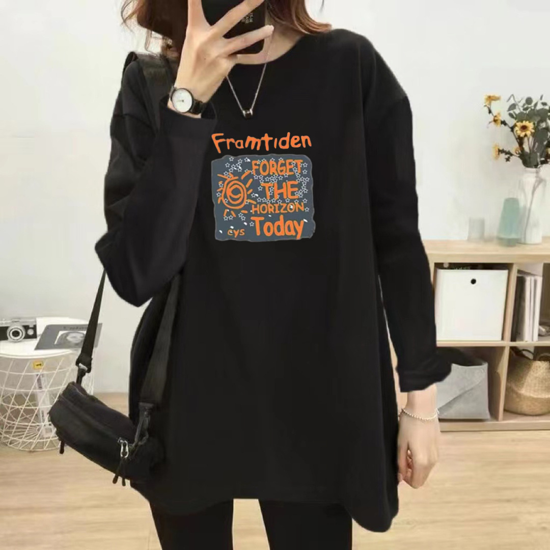 Kaus hitam lengan panjang wanita, baju atasan ukuran besar leher bulat gaya Barat longgar gaya Korea Musim Semi dan Gugur