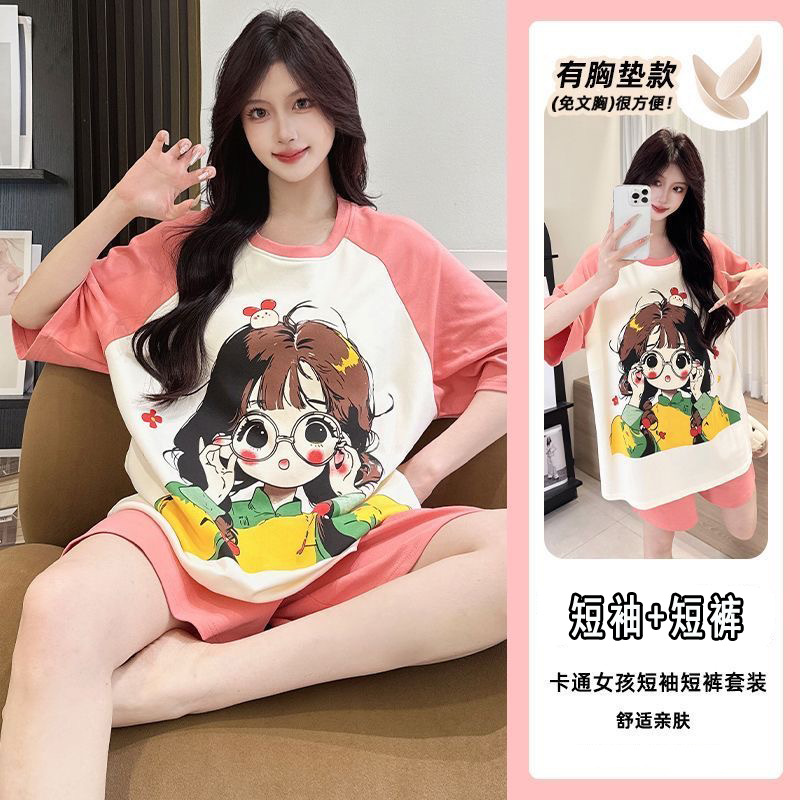 (Produk Tersedia) Baju Tidur Wanita dengan Keset Dada Musim Panas Lengan Pendek Lucu Manis Kartun Gadis Ukuran Besar Pakaian Rumah