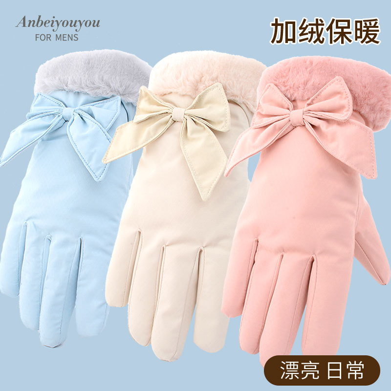 少女冬季五指手套大童加厚加绒防风骑车冬天女士女孩毛绒保暖防寒