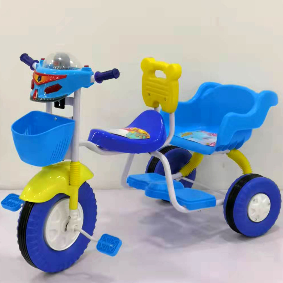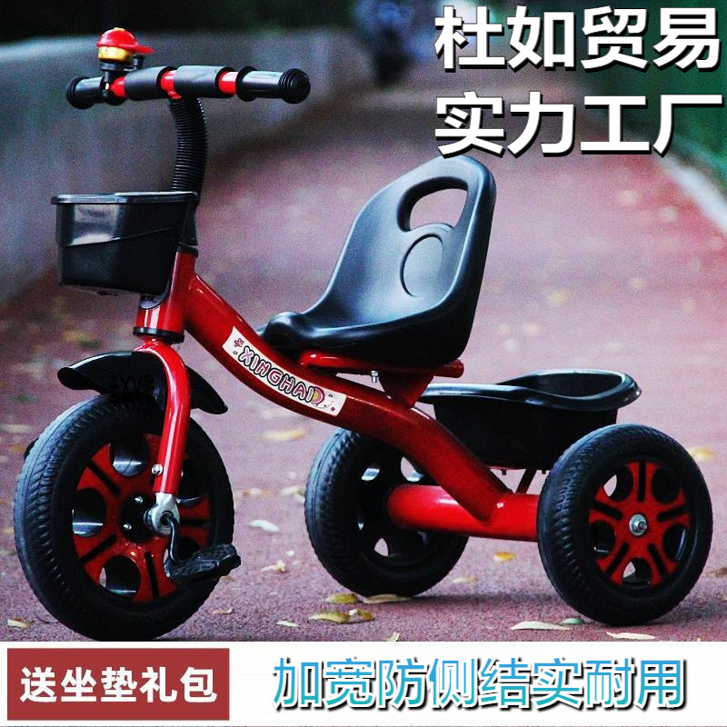 Sepeda roda tiga anak-anak, kereta dorong pedal mobil otomotif ganda, perdagangan luar negeri roda tiga kecil dapat duduk ganda dengan ember