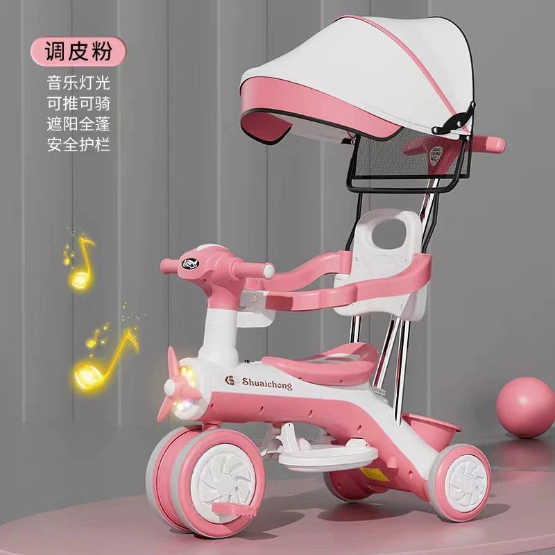 Sepeda roda tiga anak-anak dengan payung dan pagar, usia 6 bulan hingga 3 tahun, troli berkendara empat dalam satu