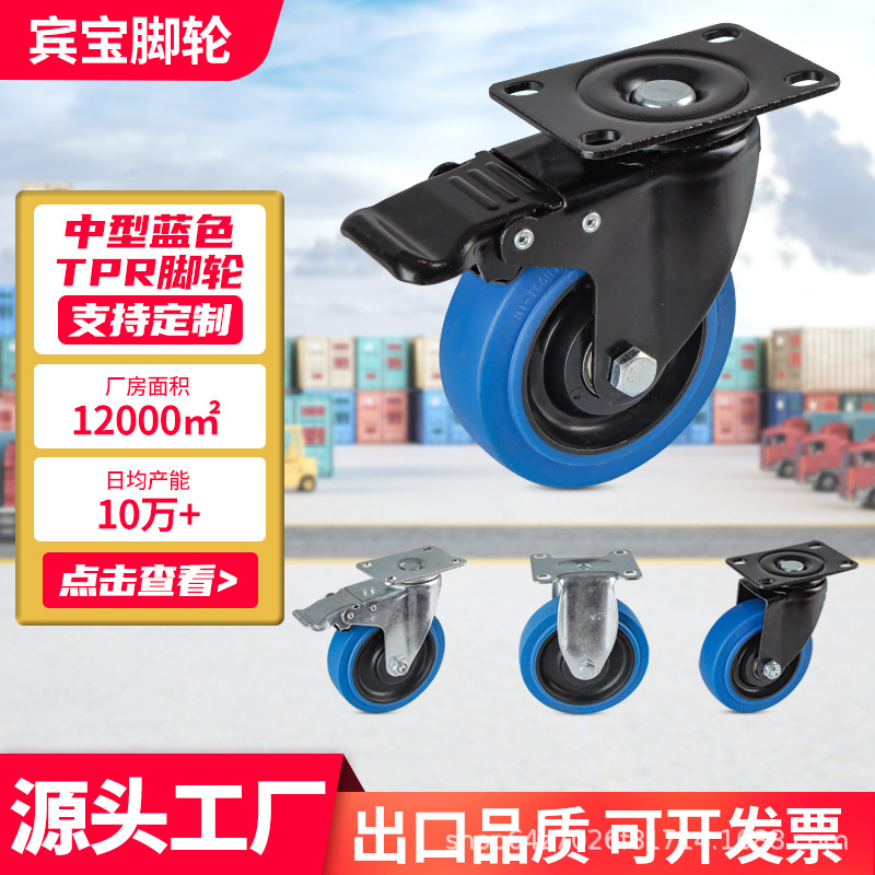 Roda kastor elastis senyap karet TPR biru Zhongshan Binbao, roda rel arah dengan rem ukuran sedang.