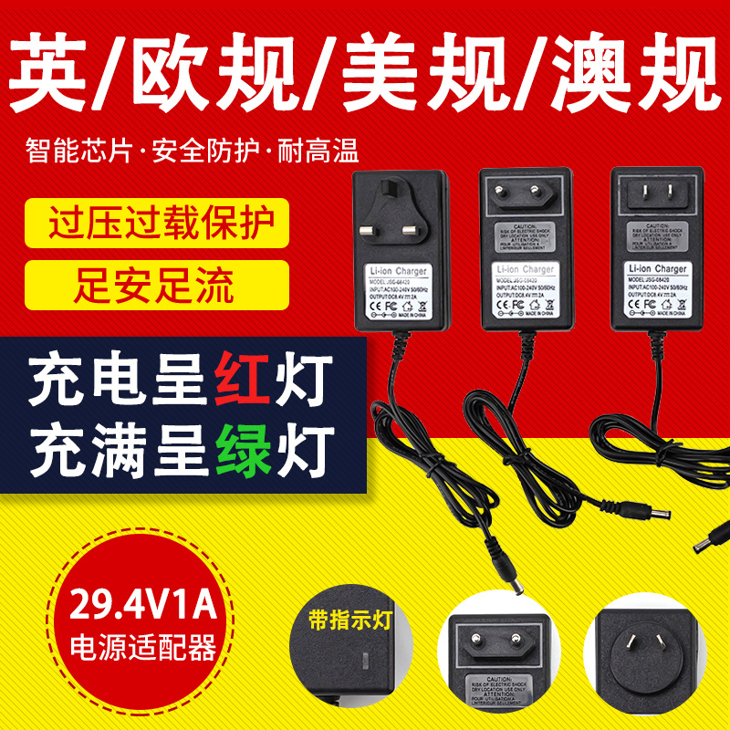 Pengisi daya baterai elektrik satu skuter, mesin pembersih listrik standar Eropa, Amerika, dan Australia, adaptor daya 29,4 v 1A