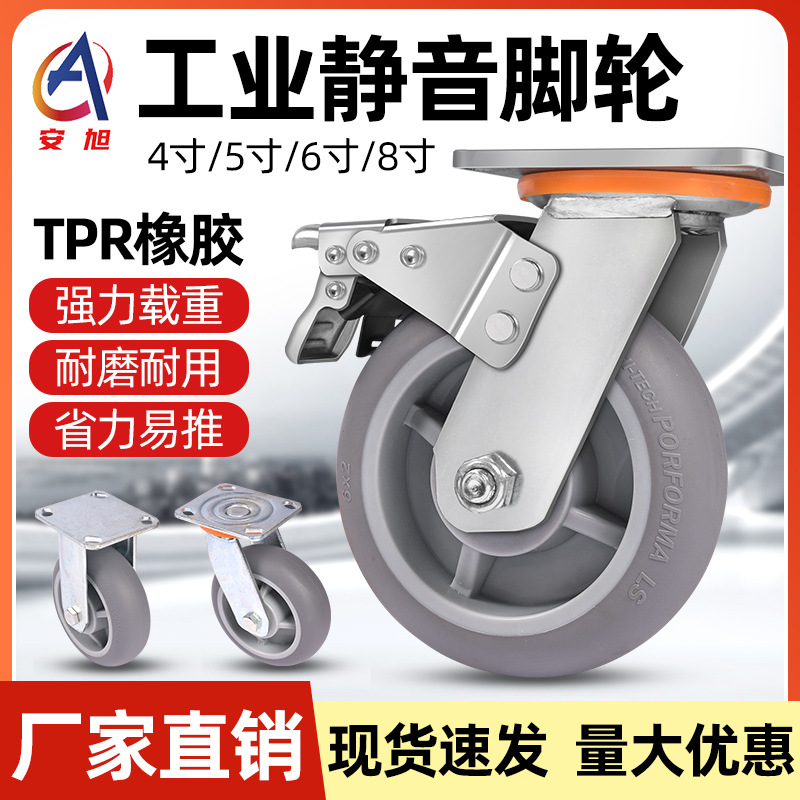 Tugas Berat TPR Kastor Karet Abu-abu Diam Roda Gimbal Industri Ekstra Tebal Kereta Dorong Roda Rem Arah Elastis