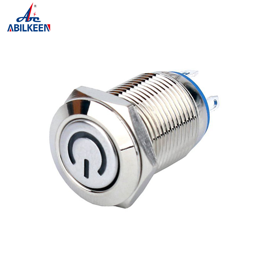 Pemasok 12mm logam 12v tombol sakelar gerobak roda kepala datar simbol daya reset sendiri tombol sakelar menyala