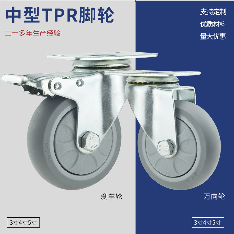 Roda troli papan 345 inci, roda troli makan TPR, roda karet abu-abu dengan rem, roda karet, roda universal, roda karet tahan aus yang senyap