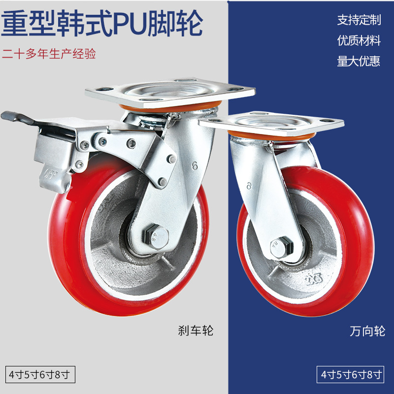 Roda kastor tugas berat dengan inti besi dan roda universal poliuretan, roda kastor mesin kendaraan traksi berbentuk busur gaya Korea ukuran 4/5/6/8 inci.