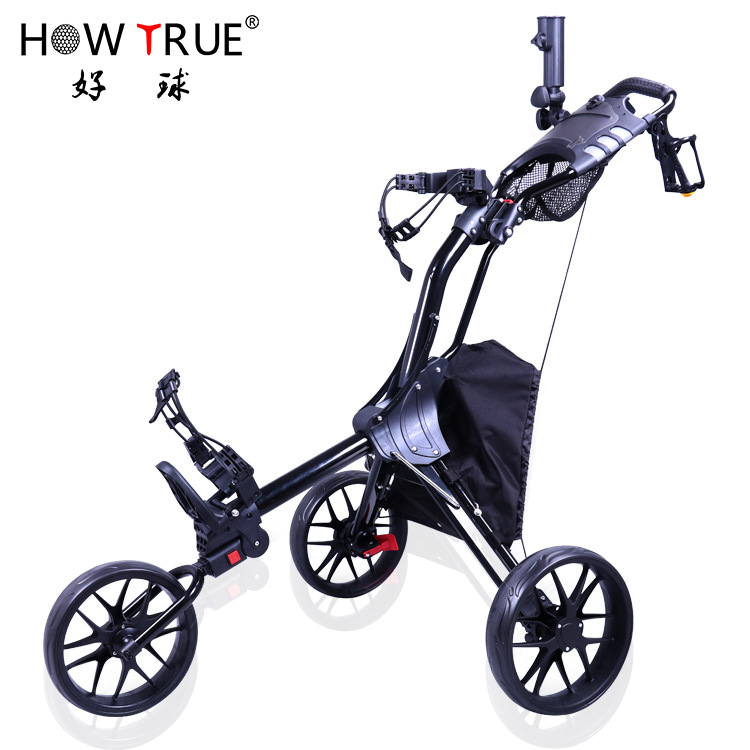 Bagaimana benar hitam tiga roda manual lipat tas bola troli aluminium Aloi golf tiga roda troli