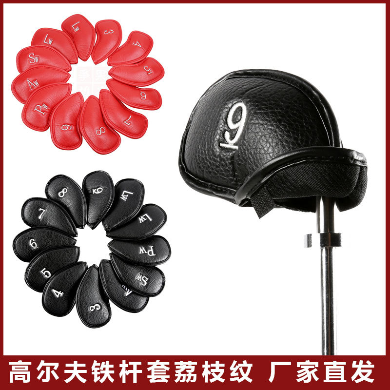 Penutup kepala golf pola lychee tenun polos dengan penutup Velcro, penutup kepala golf PU, penutup kepala golf besi, set 7-12 buah.