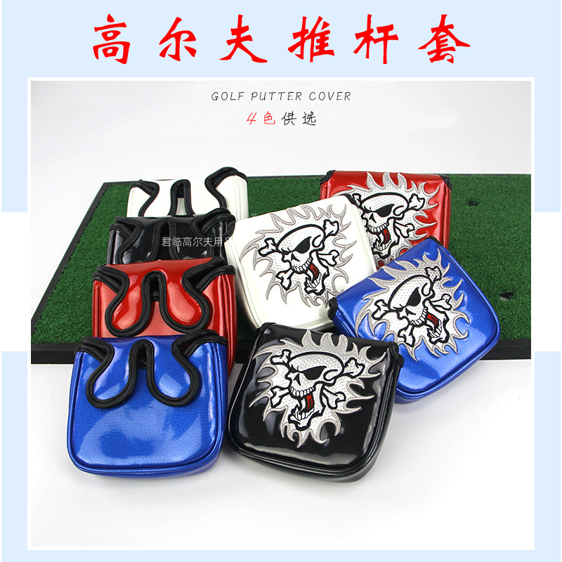 Penutup putter golf, penutup putter persegi golf bordir tengkorak PU magnet binaural 4 warna untuk dipilih