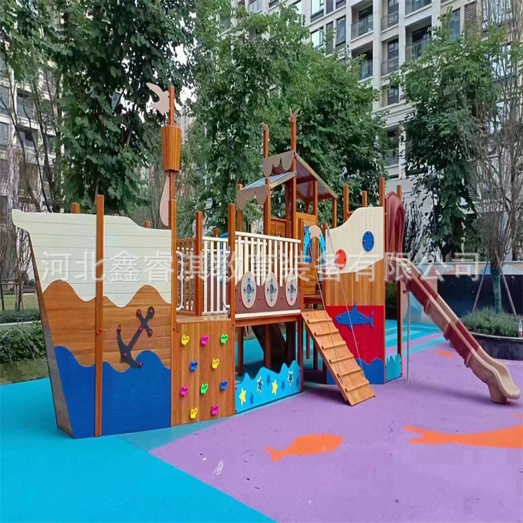 Peralatan hiburan luar ruangan taman kanak-kanak dalam ruangan bingkai panjat tebing perosotan kayu kombinasi plum pile perahu bajak laut panjat tebing