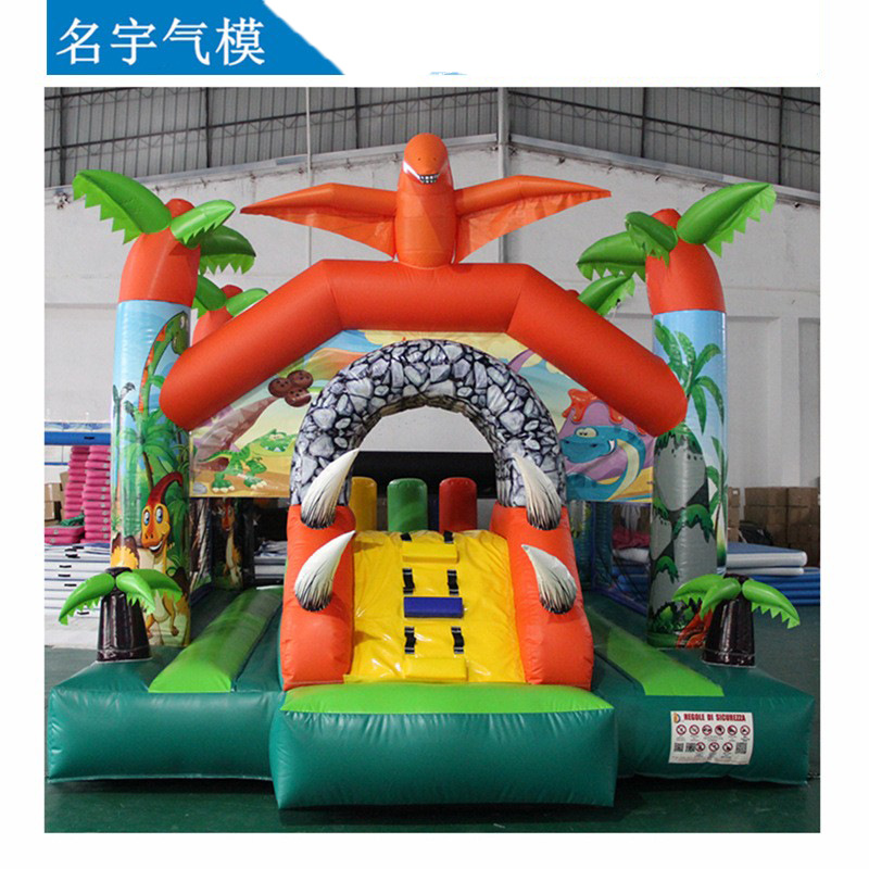 Semprotan air geser anak-anak, peralatan hiburan luar ruangan istana tiup taman kecil kartun Tyrannosaurus rex nakal trampolin