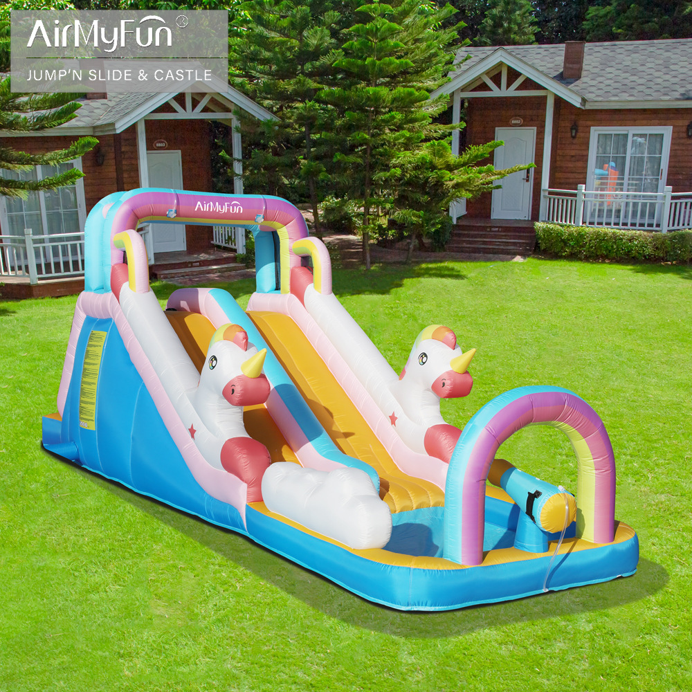 AirMyFun perosotan tiup unicorn, perlengkapan perosotan ganda dapat ditiup kecil luar ruangan