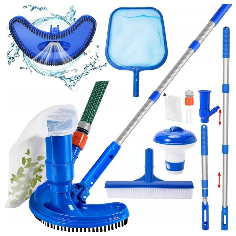 Aksesoris kepala penghisap air bersih kolam renang tiga bagian dengan batang aluminium teleskopik tiga bagian dengan sikat bawah tas filter alat pembersih
