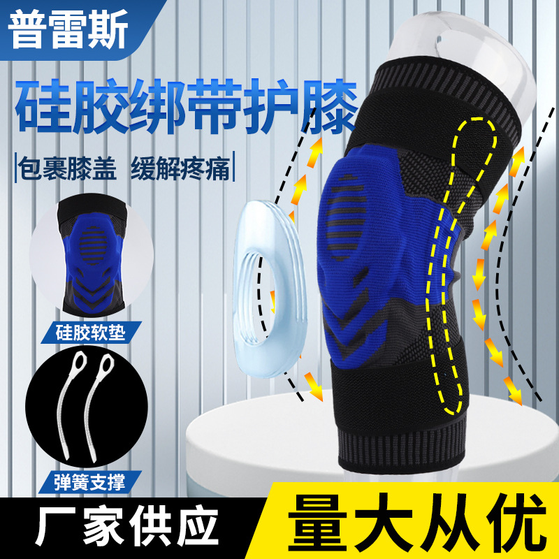 Pelindung lutut olahraga dengan penyangga pegas untuk lari dan bersepeda, penutup patela, selubung silikon rajutan, tali silikon bernapas, anti selip