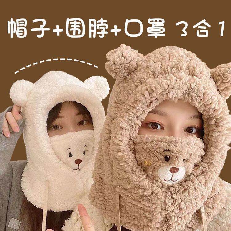 小熊口罩围巾一体帽子女秋冬骑行保暖防风帽可爱围脖加厚雷锋帽