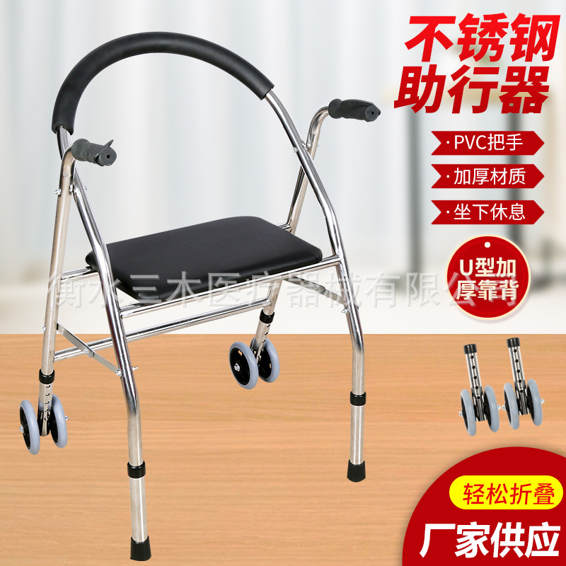 Alat bantu jalan besi tahan karat lansia, alat bantu jalan, troli empat sudut bentuk U, roda suspender belakang, alat bantu jalan
