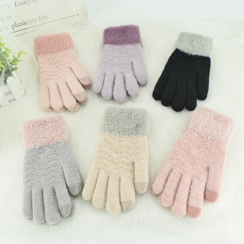 Sarung tangan rajut wanita, sarung tangan rajutan musim dingin wanita, bulu domba berlapis tebal, layar sentuh, wol lima jari berkendara luar ruangan, bersepeda tahan dingin grosir