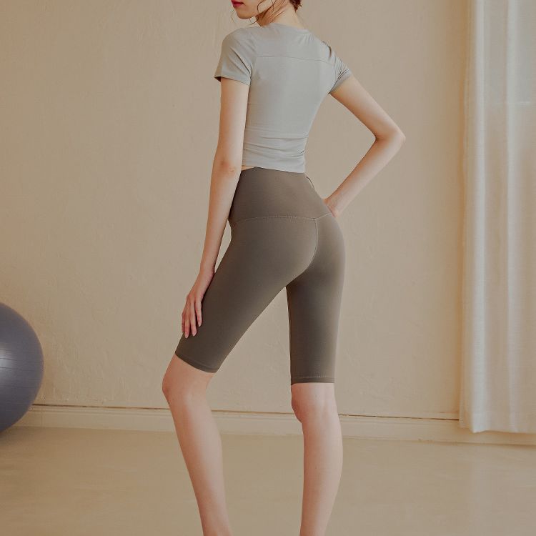 Celana pendek crop nude wanita, celana olahraga pinggang tinggi ketat bersepeda pakaian luar celana pendek yoga pinggul persik tipis musim panas