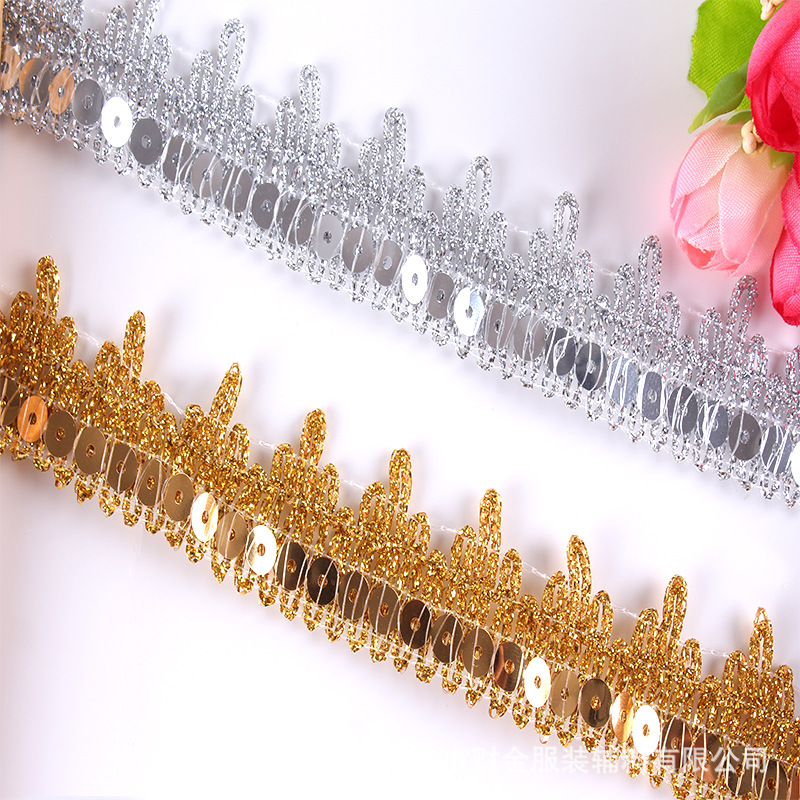 Aksesori pakaian renda wanita, aksesoris pakaian bahan renda emas dan perak pita renda payet gelombang nasional renda emas