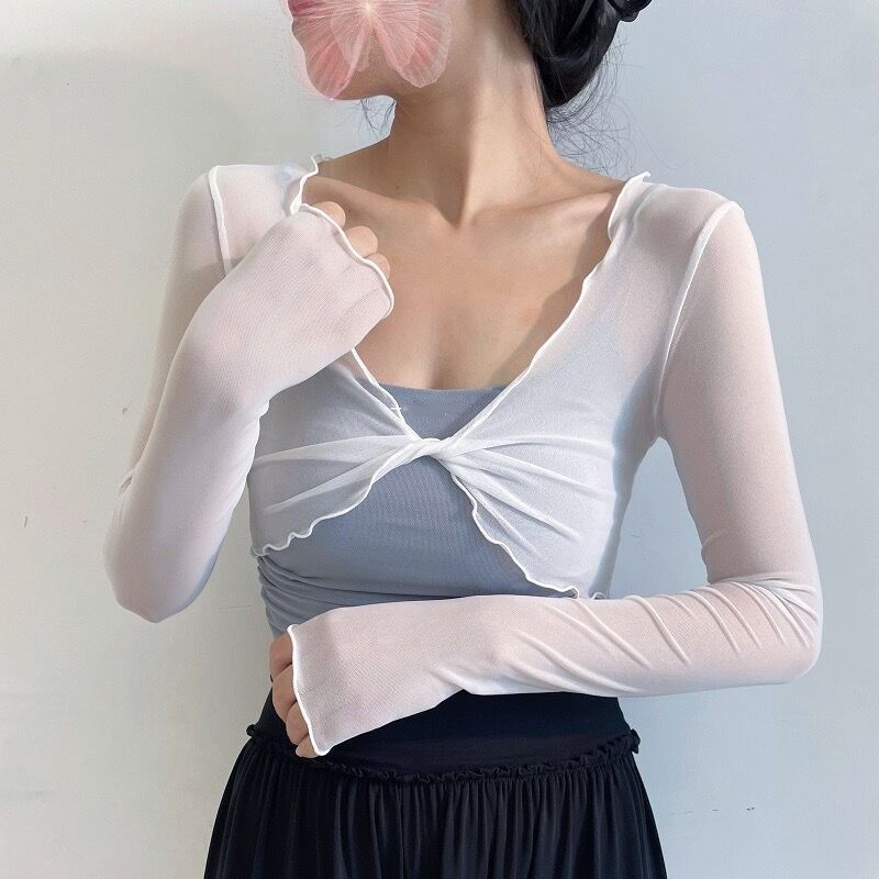 Blus jaring luar tubuh terpilin, pakaian latihan tari balet klasik leher V pendek tudung menutupi daging