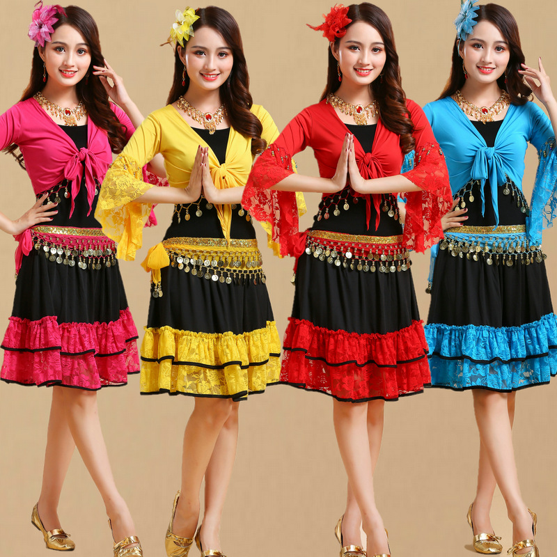 Baru pakaian dansa persegi etnis yangko kelompok dansa pakaian menari pertunjukan tari perut selendang Sling atasan lengan pendek