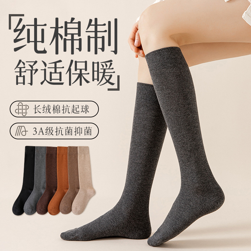 Kaus kaki betis katun hitam wanita, Kaos Kaki kurus setinggi lutut warna polos Jepang Musim Semi dan Gugur