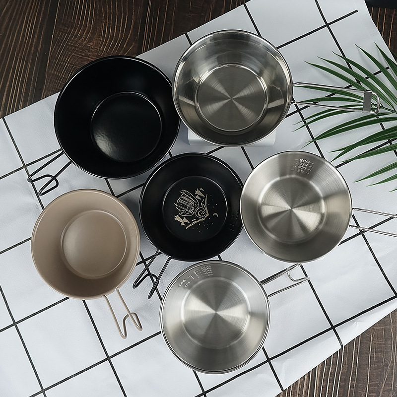Cangkir alumunium kecil luar ruangan, peralatan masak berkemah multifungsi stainless steel dengan pegangan lipat portabel mangkuk salad Kemah gunung