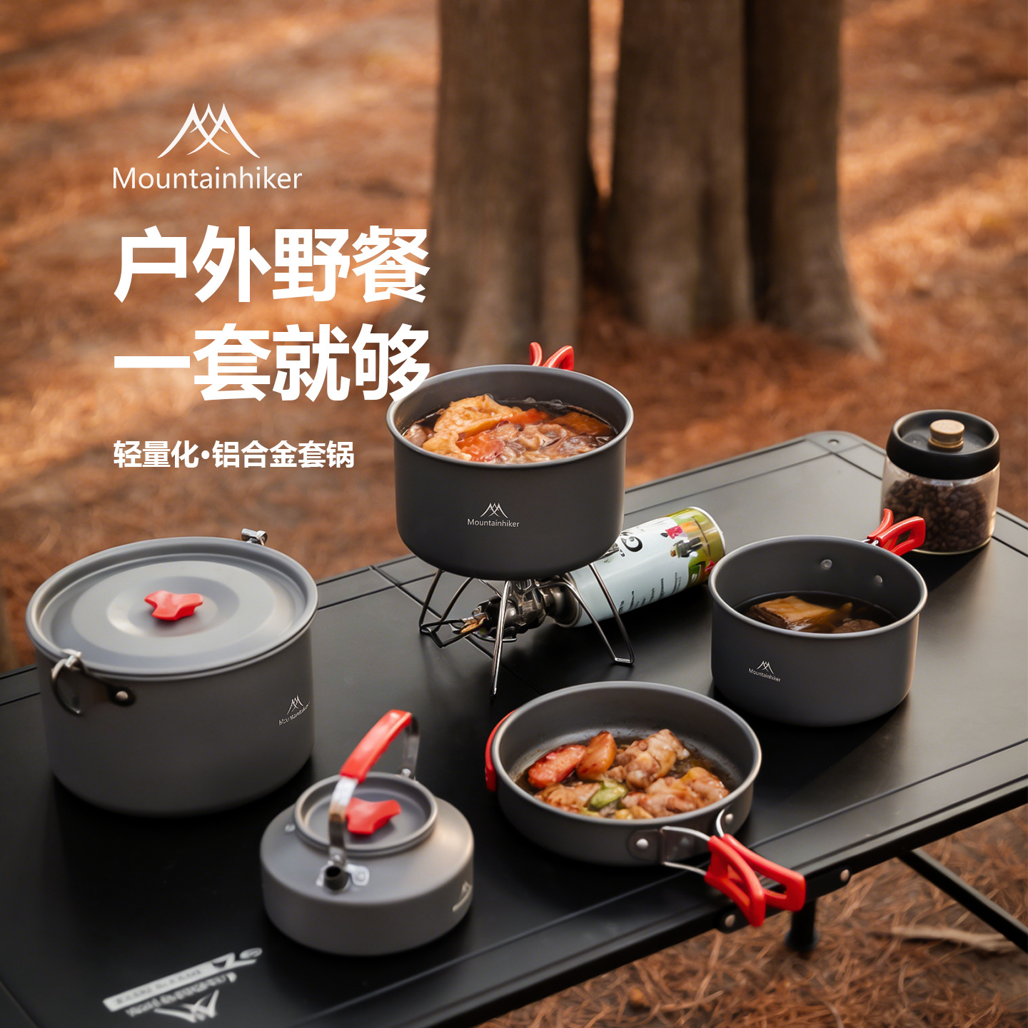 Panci masak baja tahan karat untuk camping, set panci penggorengan, panci masak baja tahan karat, piknik, berkemah di luar ruangan, tiga buah set, set empat buah