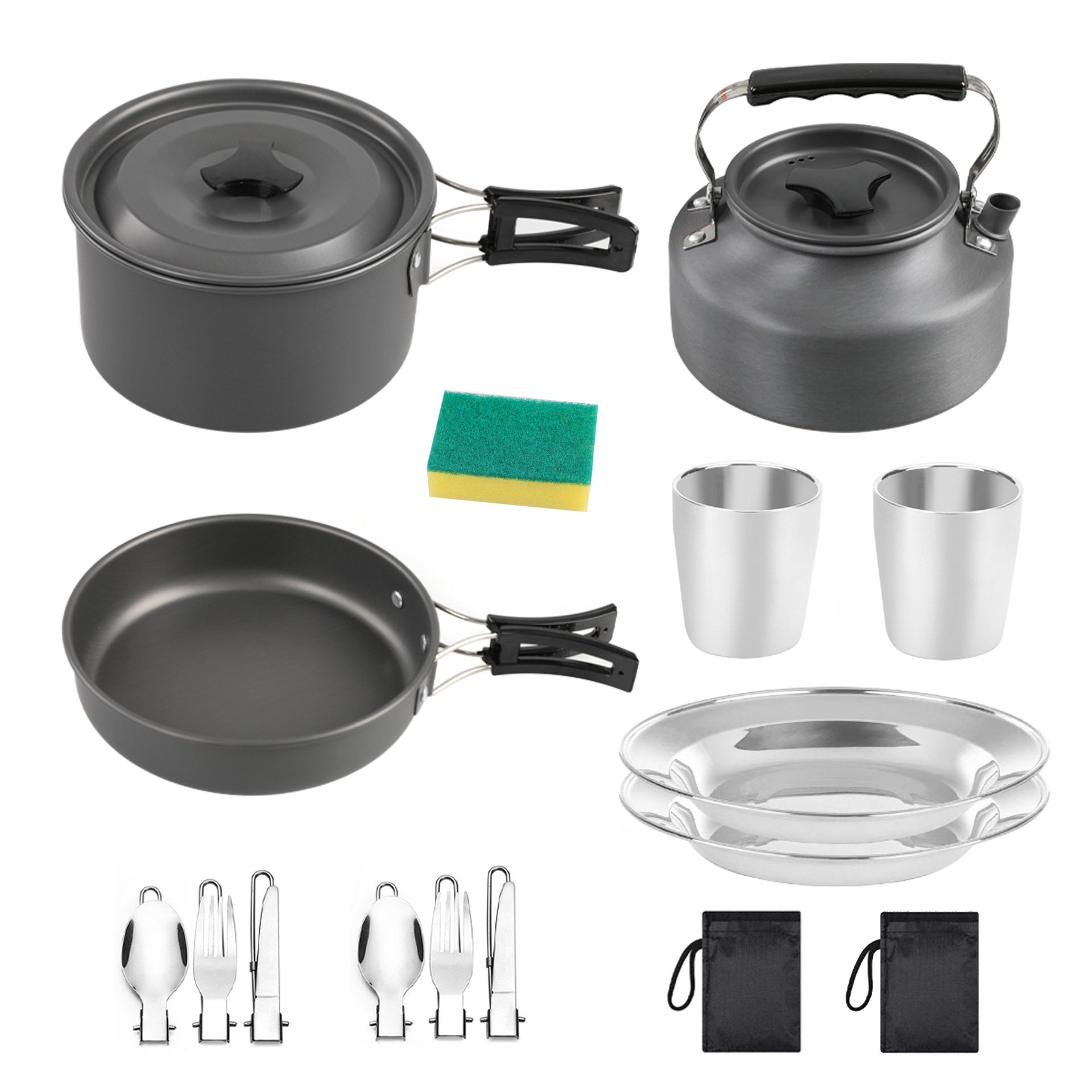 DS-310 berkemah luar ruangan, set panci dan teko stainless steel piring cangkir tas makanan cocok untuk peralatan masak berkemah portabel