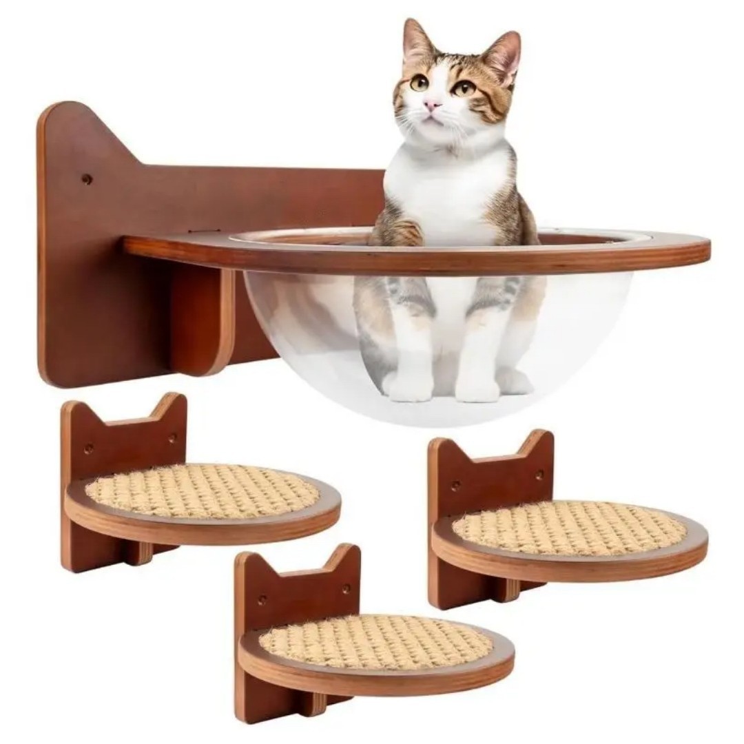 Set Tempat Tidur Gantung Kucing Kayu Hewan Peliharaan dengan Kapsul Transparan 3 Langkah Rak Panjat Kucing Alas Sisal Dinding Rak Istirahat Kucing